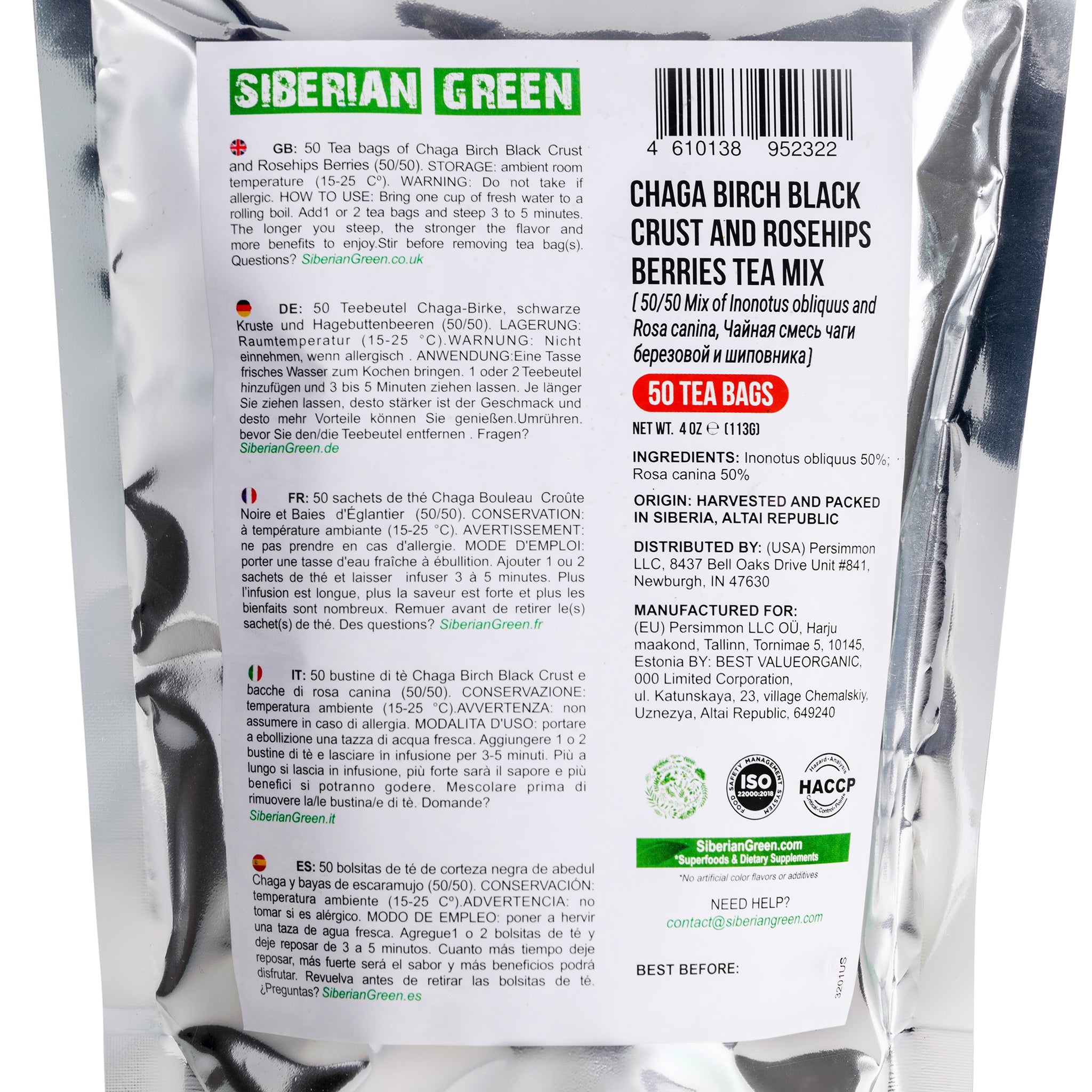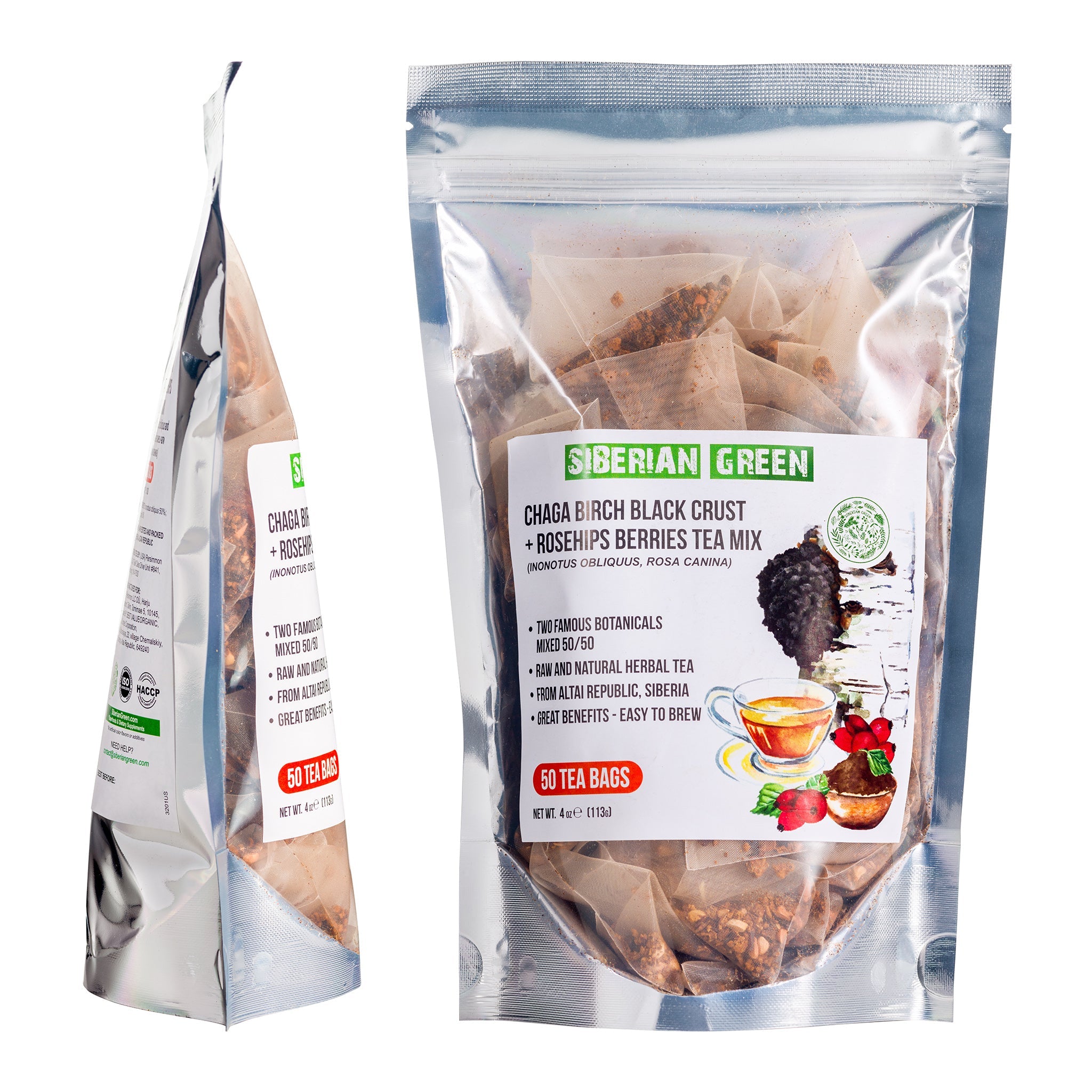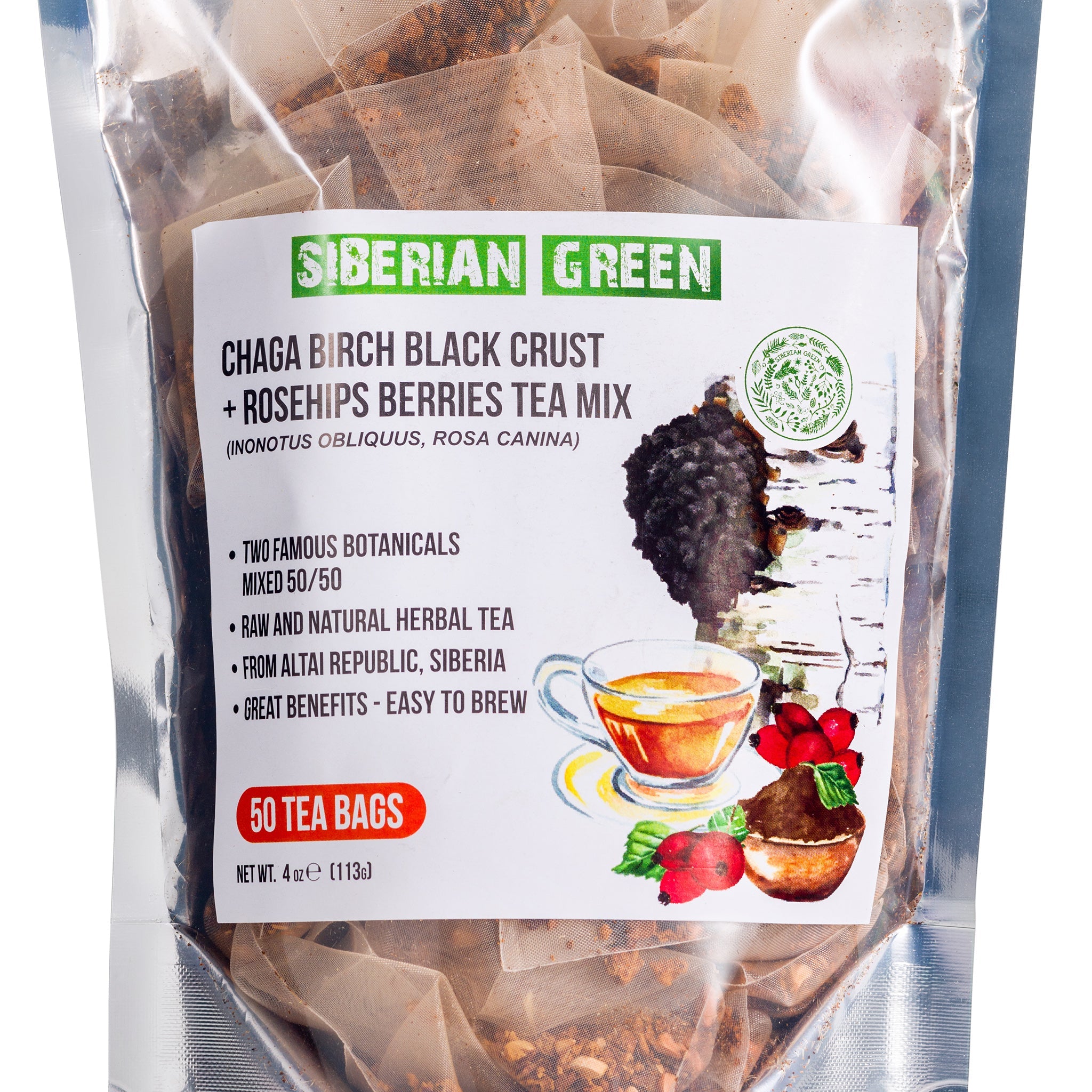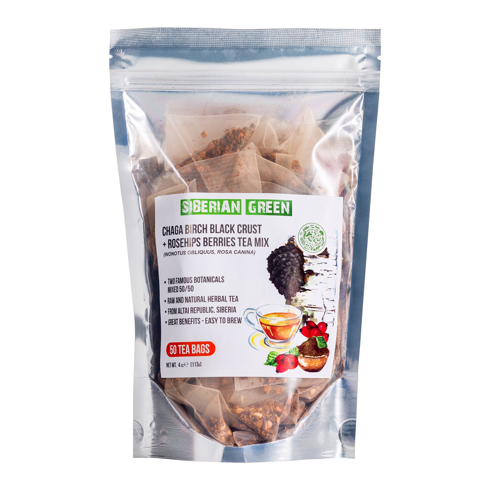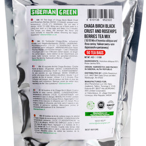 Trying Siberian Green Chaga Tea with Rosehip Berries vi offre la ricca bontà naturale del Chaga. Si tratta di una pregiata miscela 50-50 di funghi chaga raccolti in natura e di bacche di rosa canina ricche di vitamine. Il tè è ricco di antiossidanti che contribuiscono a nutrire e aiutare il sistema immunitario. Proviene dall'incontaminata regione di Altai, nella Siberia orientale.