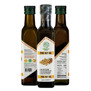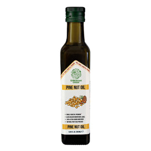 L'olio di pinoli verdi siberiani è un eccellente olio naturale spremuto a freddo prodotto da pinoli raccolti in natura, che crescono nell'incontaminata foresta della taiga vicino alle calde sorgenti curative dei monti Altai. Quest'olio di pinoli extravergine di prima qualità, monovarietale, contiene una grande quantità di sostanze nutritive e viene lavorato con la tradizionale prima spremitura a freddo, che ne protegge i robusti benefici per la salute, il sapore delicato e il colore dorato chiaro.